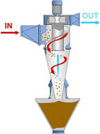 當(dāng)含塵氣流由進(jìn)氣管進(jìn)入旋風(fēng)分離器時(shí),氣流將由直線運(yùn)動變?yōu)閳A周運(yùn)動。旋轉(zhuǎn)氣流的絕大部分沿器壁自圓筒呈螺旋形向下沿錐體流動。含塵氣體在旋轉(zhuǎn)過程中產(chǎn)生離心力,將重度大于氣體的塵粒甩向器壁,沿壁面下落到底部卸料閥排出,將塵粒從氣體中分離出來的一種氣固分離裝置。